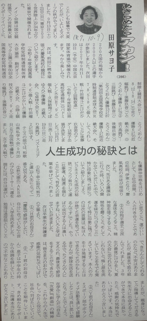わかやま新報掲載コラム「あきらめたらアカン!」令和7年10月9日